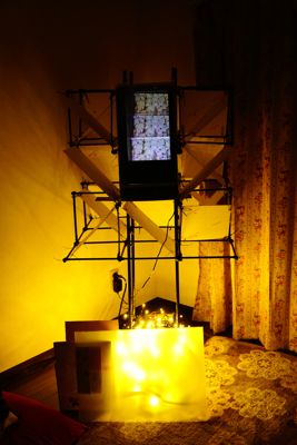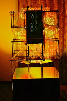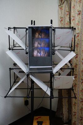 ![]() イルミネーション自体も、すべて反射を利用しようと思った。一番下に光源をかためて配置し、 空中に反射板が置かれたものを作ろうと思った。いくつかスケッチを描き、最初は木のように1本の 軸から様々な方向に反射板を設置しようと思ったが、制作と耐久性を考え、沢山のキューブの集合にしようと 考えた。3Dツールで作ってみて、ガラスの位置を色々と変える事により、見える像の距離が変わるように、 またどの面も必ず光を反射出来るように配置を考えてみた。フォトフレームを利用した表示装置は、 真ん中丈夫に取り付けることにした。