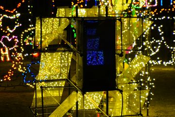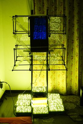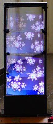 出展場所 あしかがフラワーパーク イルミネーションコンテスト 期間 2015年 10月25日 点灯式 2016年2月4日まで出展 使用LED 1000球 大きさ 横幅 高さ155cm 幅、奥行き 75cm 今年のテーマ 仕事でヘッドアップディスプレイに関わっていた為、今年は反射させて虚像を見る物を作ろうと思った。 最初はスマホやフォトフレームを下において、虚像を複数見せるもの、ちょっとずつ奥行きが変わるものを 考えて作ってみた。かなり面白いものが出来たので、使わなくなったフォトフレームを使いイルミネーションに 組み込む事にした。