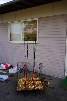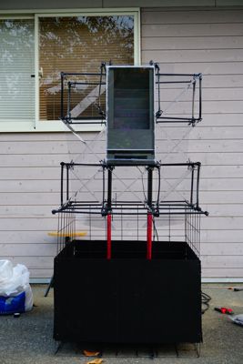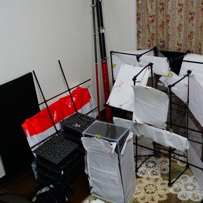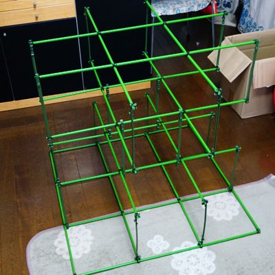 ![]() 制作 フォトフレームを使ったディスプレイを真ん中に置く場合、1辺が25cm、全体が75cmになった。 75cm の立方体を作った場合、車に載るか計ってみると無理だった。この為一度作った後分解して運び 現地でもう一度組み立てる方針にした。 組み立てやすく、ある程度強度がある材料を探しまわり、今回は百均の園芸用の棒を使う事にした。 真ん中を貫く4本の支柱は、これも園芸用の150cmのモノを4本使う事にした。