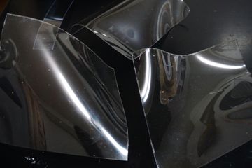 ![]() 反射板にはアクリルパネルを使う事にした。1mmの薄めの物で、畳一畳程の大きさの物を購入し、 店の工作室でアクリルカッターを使って切断した。今回は大きなパネルを2枚かって、25枚分の 反射板と、フォトフレームのディスプレイを入れる為の防水ケースを作る為に利用した。 アクリルパネル25枚の取り付けは、方向に注意する必要があるし結構大変だった。傷つき防止と 透明だと見辛いので保護用の紙を貼ったまま作成した。