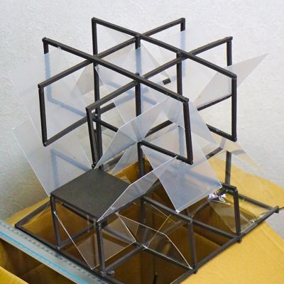 ![]() 反射板のプロトタイプ どのような実現方法が良いか色々と試行錯誤しながらプロトタイプを作ってみた。 最初は1つ1つ立方体と反射板を持つ物をつくり、これを積み上げて作ろうと考えたけど、 27個の立方体と反射板を作るのはかなり大変だとやりかけてみて実感した。 プラバンと100均のスチロール系のボードを棒状に切って使い、簡単な反射板部分を作ってみた。 プラバンが足りなくなり残りは半透明のモノにしてみた。立体を27個つくるより楽になったけど、 これはなかなか大変だと思った。 箱にLEDを入れて、その上に置いてみると、小さいけど割と面白い物が出来そうな気がしてきた。