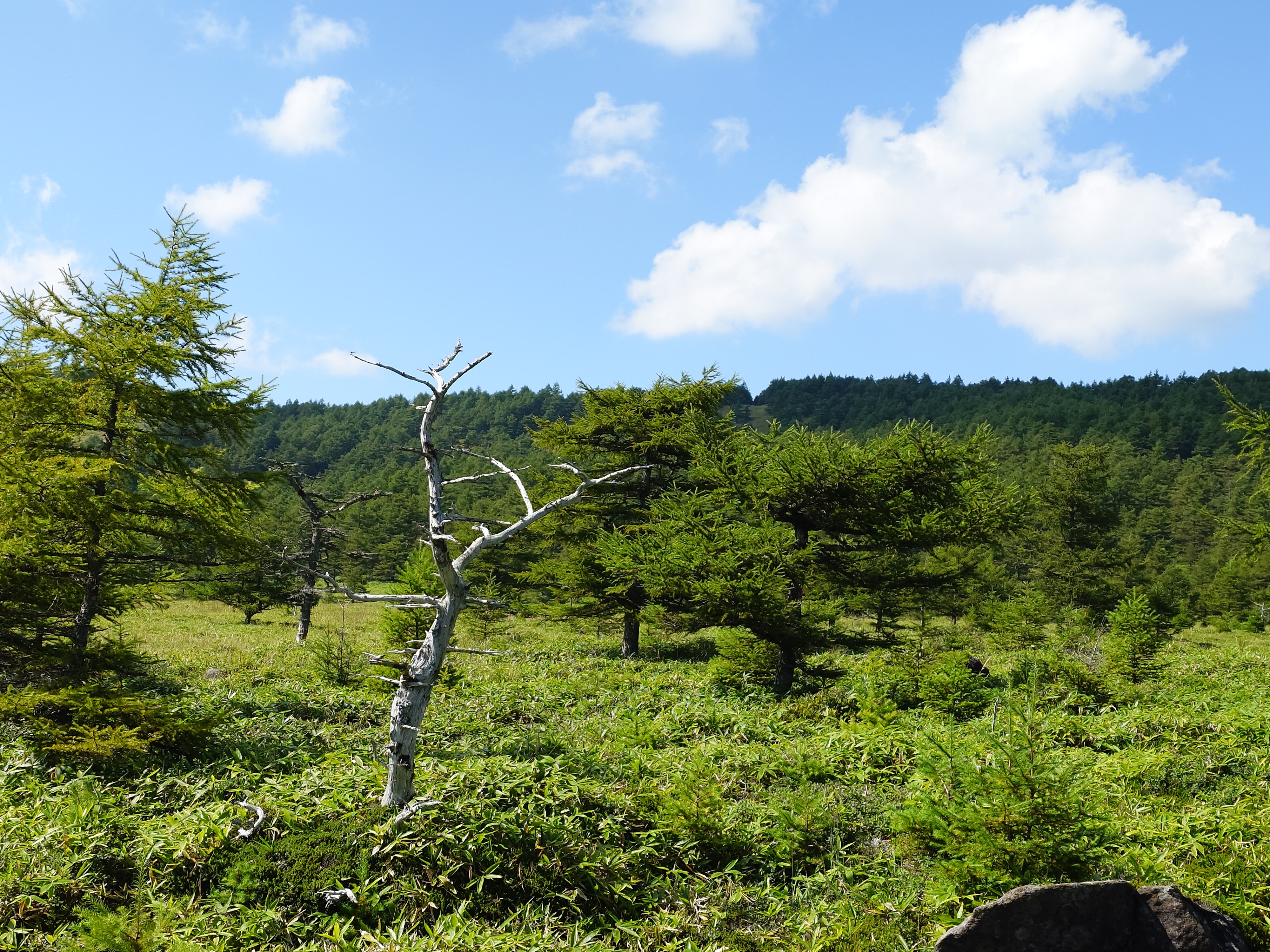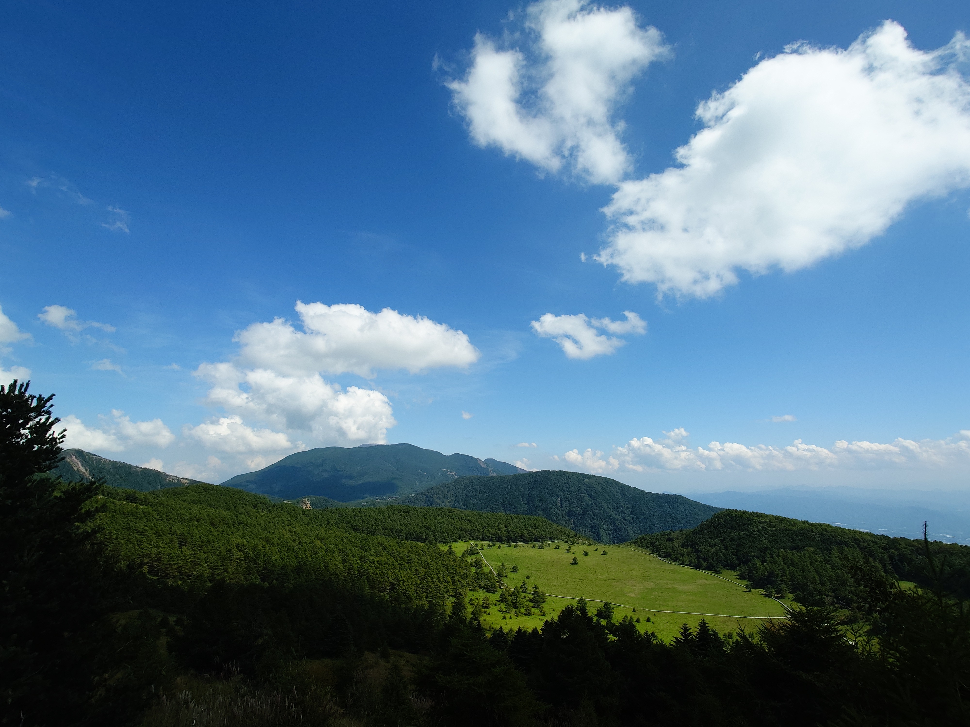 2025年の夏は連日猛暑、体温並みの日が続き、なかなか行楽に出て行く気にはなれなかった。 前日に思い切って近所の公園を散歩して、やっぱり出歩くのは気持ち良いなと思い、もう少し 気持ち良く歩ける所へ行きたいと思った。 軽井沢へ行こうと思った。浅間2000や池の平が気持ち良く楽しかったのを思い出した。 あまり出発は早くなかったけど、渋滞もなく、休憩もなしで浅間2000まで登ってきた。 天気も良いし、池の平を目指し未舗装道路を登る事にした。 登山するつもりで出掛けてなかったので、かなり軽装で歩き出した。 何だか細く登りの多い道だと思いながら登り始めた。途中で湿原に向かう道ではなく周りの 山に登る道に来てしまった事に気付いたが、以前に歩いたはずのルートで、暑いけど 下界とは全く異なり木陰はかなり気持ちが良かったので、このまま進む事にした。 途中でいくつかの小さなピークを超えた。 見晴岳は外周を回るコースから100m程先にあるが、寄って行く事にした。 浅間山はてっぺんが少しだけ顔を見せる程度だったけど、周りの山々や下界が見渡せた。 池の平湿原に降りて行った。 花は以前に来た時期に比べかなり少ないけど、ここを散策するのは特別に気分が良く、 贅沢な散策だと思った。 ぐるっと一周して、本来歩くつもりだった湿原へのゆるい坂道を登り駐車場に戻った。 |